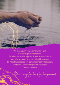 Wir laden zum Tauferinnerungs– und Schnullergottesdienst ein! Familien mit Kindern jeden Alters, aber natürlich auch alle anderen sind herzlich willkommen.
